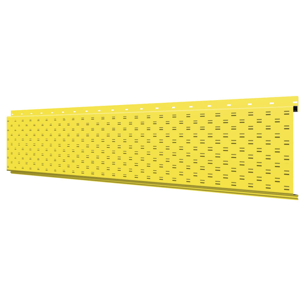 Линеарная потолочно-стеновая панель с ПЕРФОРАЦИЕЙ для вентиляции цвет RAL1018 Желтый применяется в качестве софитов для подшивы крыши, наружной и внутренней отделки потолков, стен, фронтонов фасада дома в Курске.