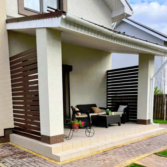 Перила входной группы из металлического планкена в цвете RAL 8017 Шоколад покрытие полиэстер. Глубокий шоколадный оттенок гармонично вписывается в архитектуру дома, подчеркивает теплоту фасада и придает всей конструкции завершенный внешний вид. Одностороннее покрытие полиэстер обеспечивает защиту от атмосферных воздействий и долговечность эксплуатации, сохраняя привлекательный внешний вид на долгие годы.